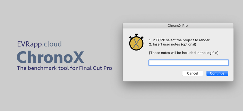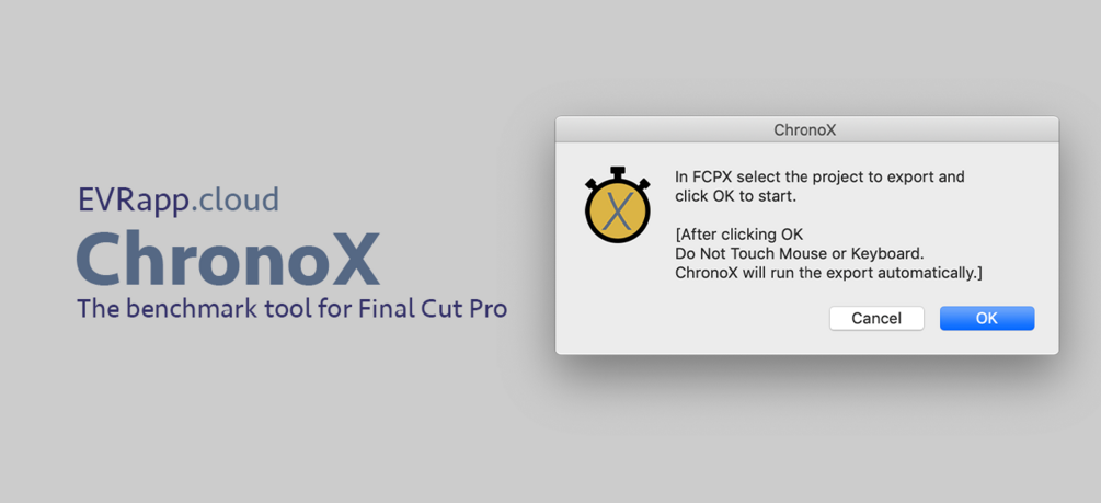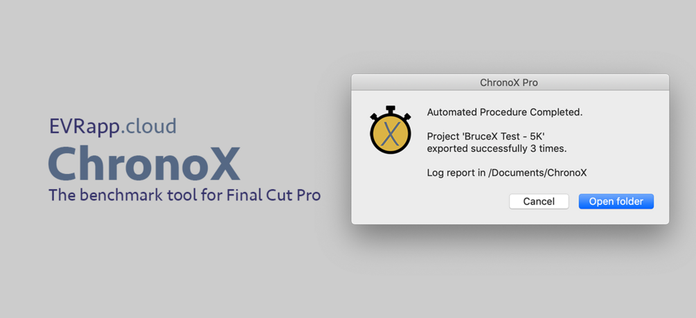 ChronoX measures the elapsed time of Final Cut Pro exports in a precise and fully automated way. No more handheld timer to stop. ChronoX, using a proprietary algorithm, identifies the precise moment in which Final Cut Pro starts the export process to the end, allowing it to calculate the elapsed time in seconds.