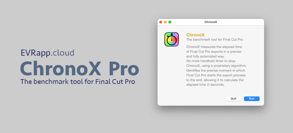 ChronoX measures the elapsed time of Final Cut Pro exports in a precise and fully automated way. No more handheld timer to stop. ChronoX, using a proprietary algorithm, identifies the precise moment in which Final Cut Pro starts the export process to the end, allowing it to calculate the elapsed time in seconds.
