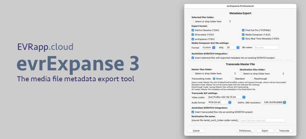 Transcode any MOV / MP4 / MXF /GoPro Raw .360 source media to Apple ProRes, Avid DNxHR, GoPro Cineform, DPX and OpenEXR and copy the source metadata including any Finder tags (keyword and / or colors) into the transcoded file. The transcoding functionality is based on FFmpeg and has been designed with ease of use and efficiency in mind, giving the user only a few options to select from for a smart, smooth and fast experience.