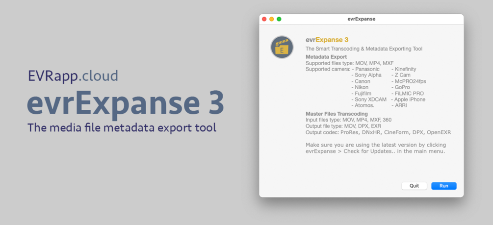 Camera specific metadata support: Panasonic, Nikon, Sony Alpha, Fujifilm, Canon, Sony XDCAM, ARRI (mov), Z Cam, Kinefinity, Atomos (Ninja & Inferno), McPRO24fps, GoPro, FiLMIC PRO, Apple iPhone.