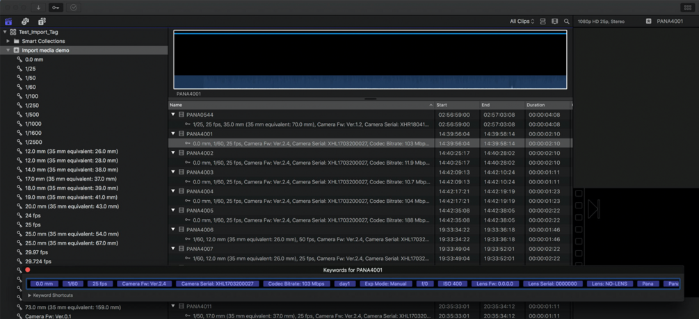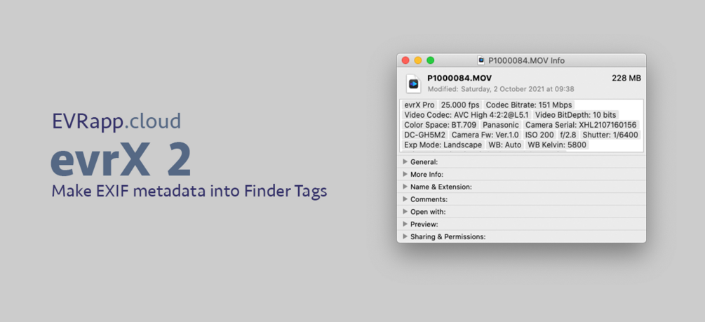 Exif Video Resolved X for Final Cut Pro is a utility that makes EXIF metadata such as ISO, Aperture, Shutter, Lens Type, Gamma, Color Space, Focal Point, etc., into macOS Finder Tags, giving you the ability to import Finder Tags as Keyword in Final Cut Pro and to search and organize your media by Keyword Collection or Smart Collection.
